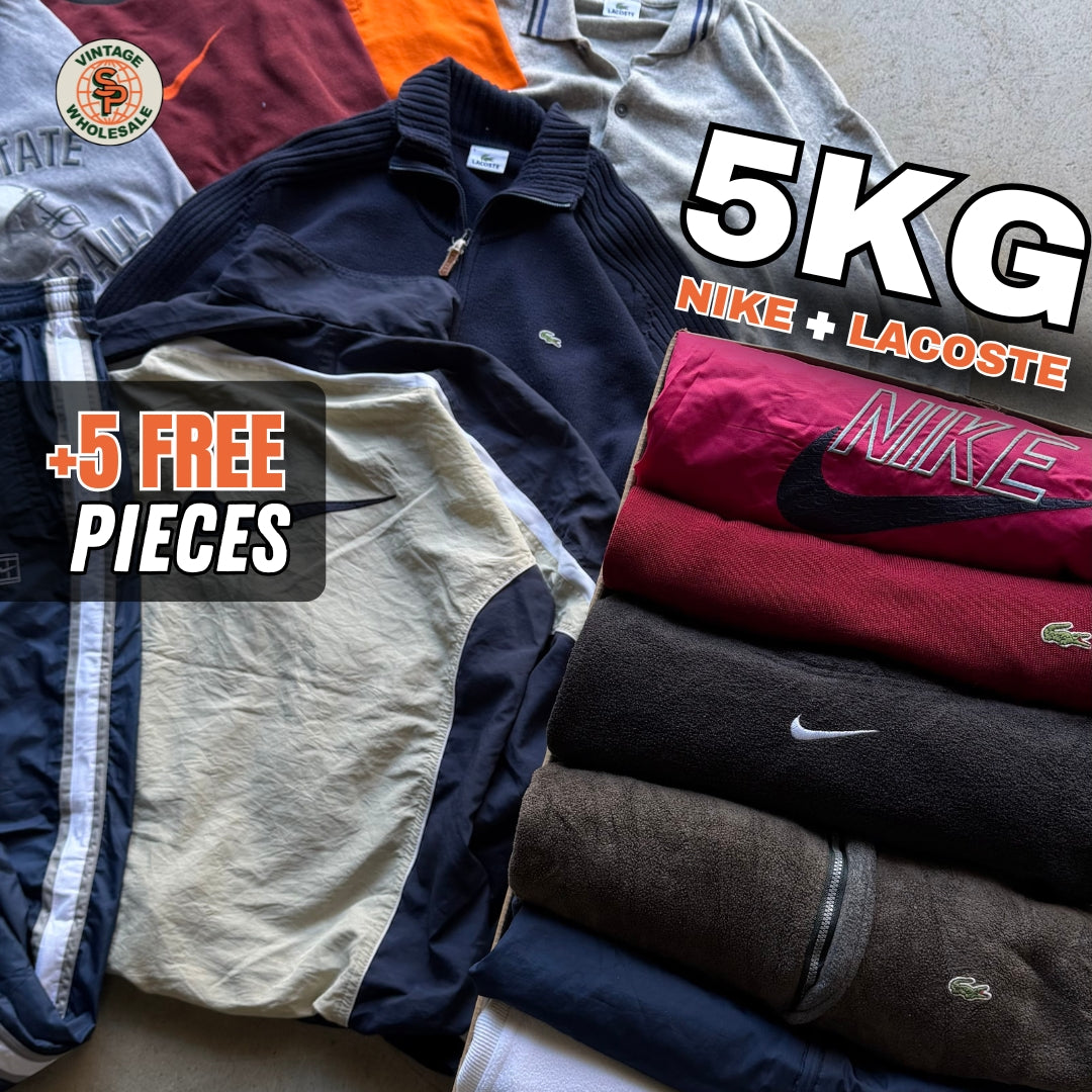Dentro de la box encontrarás una mezcla variada y comercial de sudaderas, camisetas, polos, jerséis y chaquetas Nike y Lacoste, todas revisadas para asegurar logos visibles, buena estética y un estado óptimo para la venta directa.