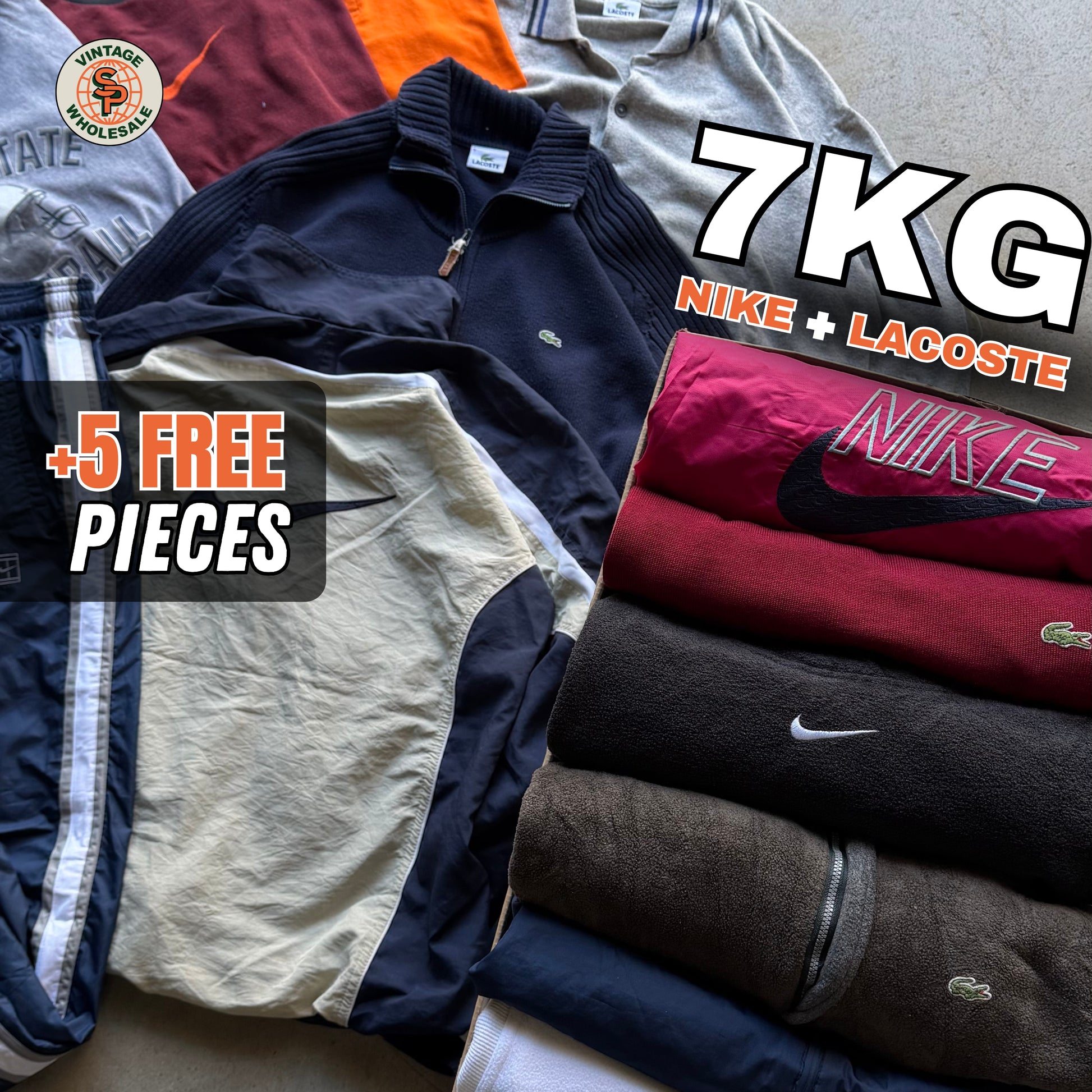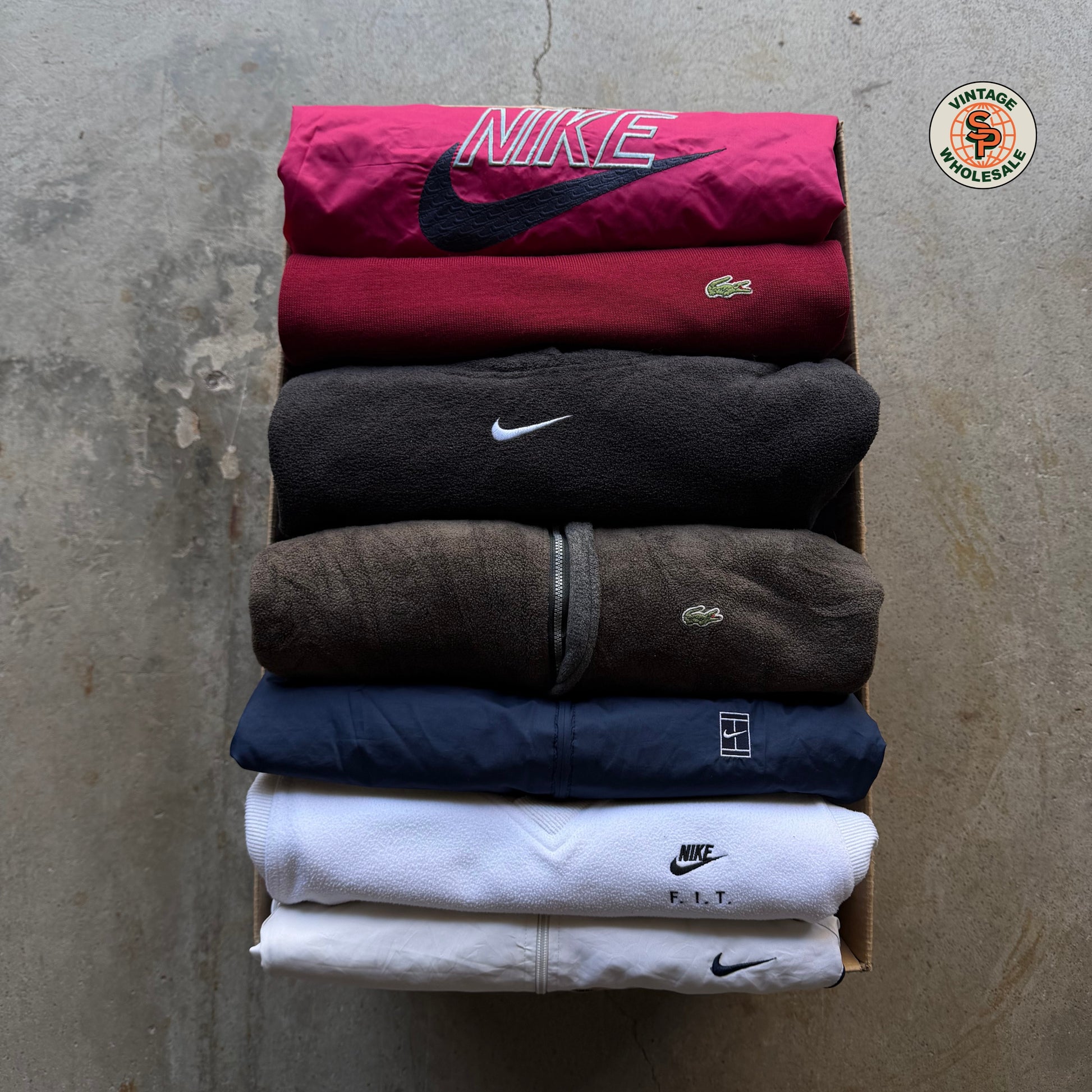 Caja combinada de 3,5kg de Nike + Lacoste auténticos, seleccionados por unidad para crear un mix comercial, reconocible y fácil de vender dentro de la reventa vintage.