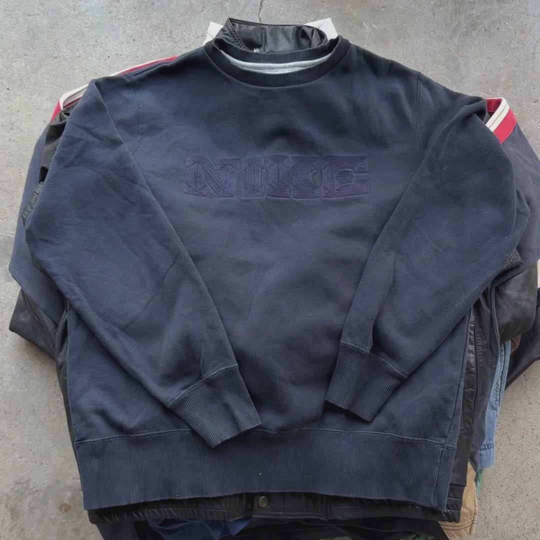El pack incluye una mezcla equilibrada de camisetas y sudaderas Nike junto a chaquetas de piel vintage, todas en estado Grado A, con buena imagen comercial y listas para vender desde el primer momento.