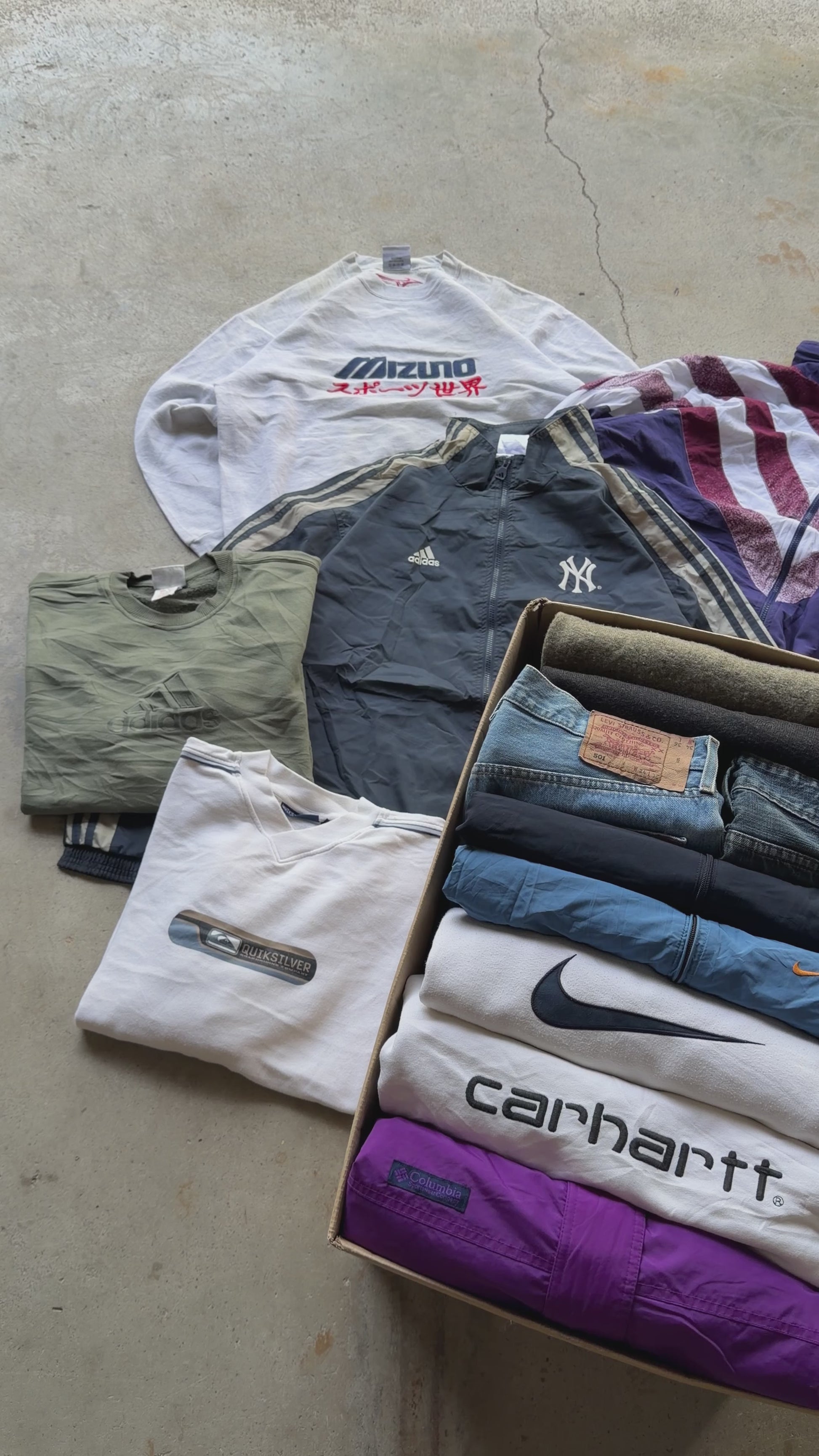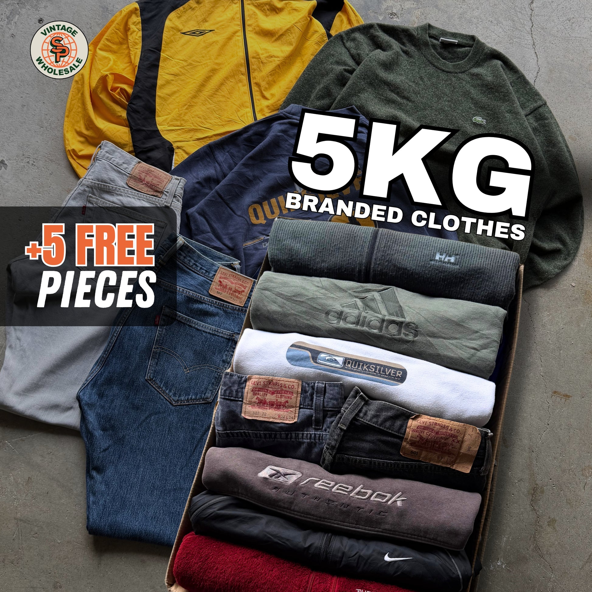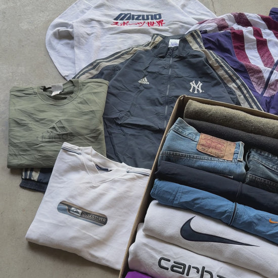 Cada caja incluye 5 kg de ropa vintage de marca (Grado A): sudaderas, camisetas, camisas, chaquetas y más.